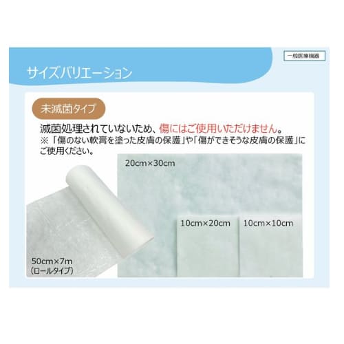 広範囲の保護や軟膏剤のカバーに最適な未滅菌タイプは、必要なサイズにカットして使用できる自由度があり、コストパフォーマンスを重視する長期的なケアに活用されています。